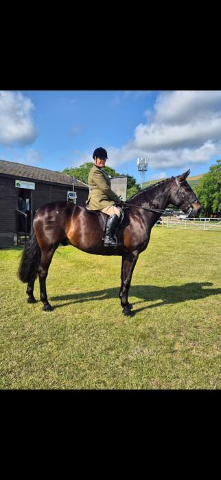 Impressive 17.3 hh Irish dark bay gelding by Kings Master. 16 years old. A versatile big horse who rides easily for his size. Has hunted regularly and field mastered for 3 years. Takes the country as he finds it.